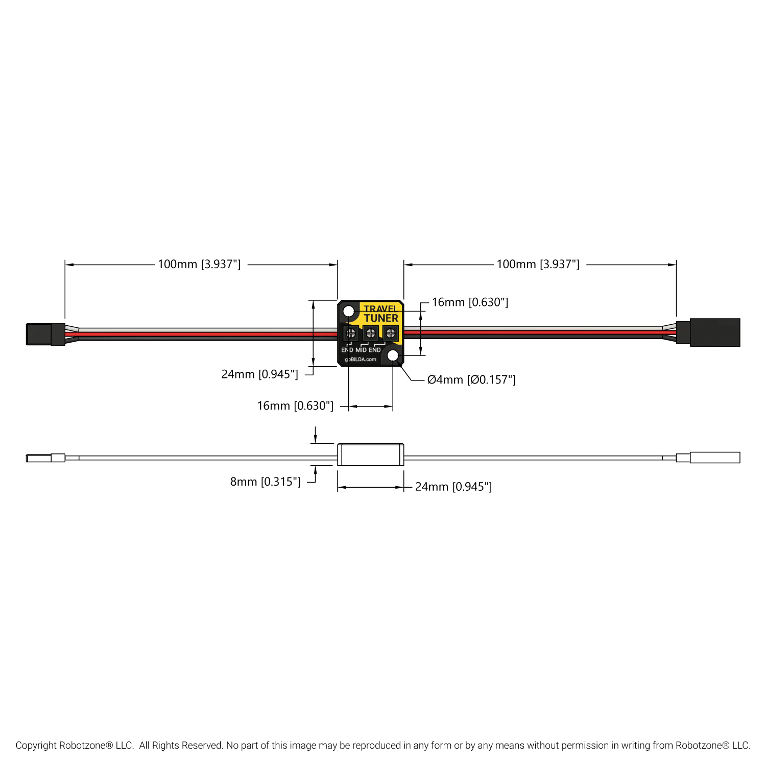 The amount that a servo can rotate is based on the signal it receives from the servo controller it is connected to. If the servo controller is not able to send the desired range, you may not be tapping into the full potential of your servo. The Servo Travel Tuner allows you to adjust the range of the servo regardless of the signal being sent! While a microcontroller gives you the ability to pick the signal range that you send to your servo, many servo controllers have strong roots in the remote-controlled vehicle market which has adopted a much narrower signal range. The Servo Travel Tuner plugs in, much like a servo extension, and gives you three dials to adjust the servo to your liking. Turn the dials up to achieve more travel or turn them down to have fine precision control over a very limited range. Have a project that requires more travel on one side of center than the other? – Each side is fully independent!