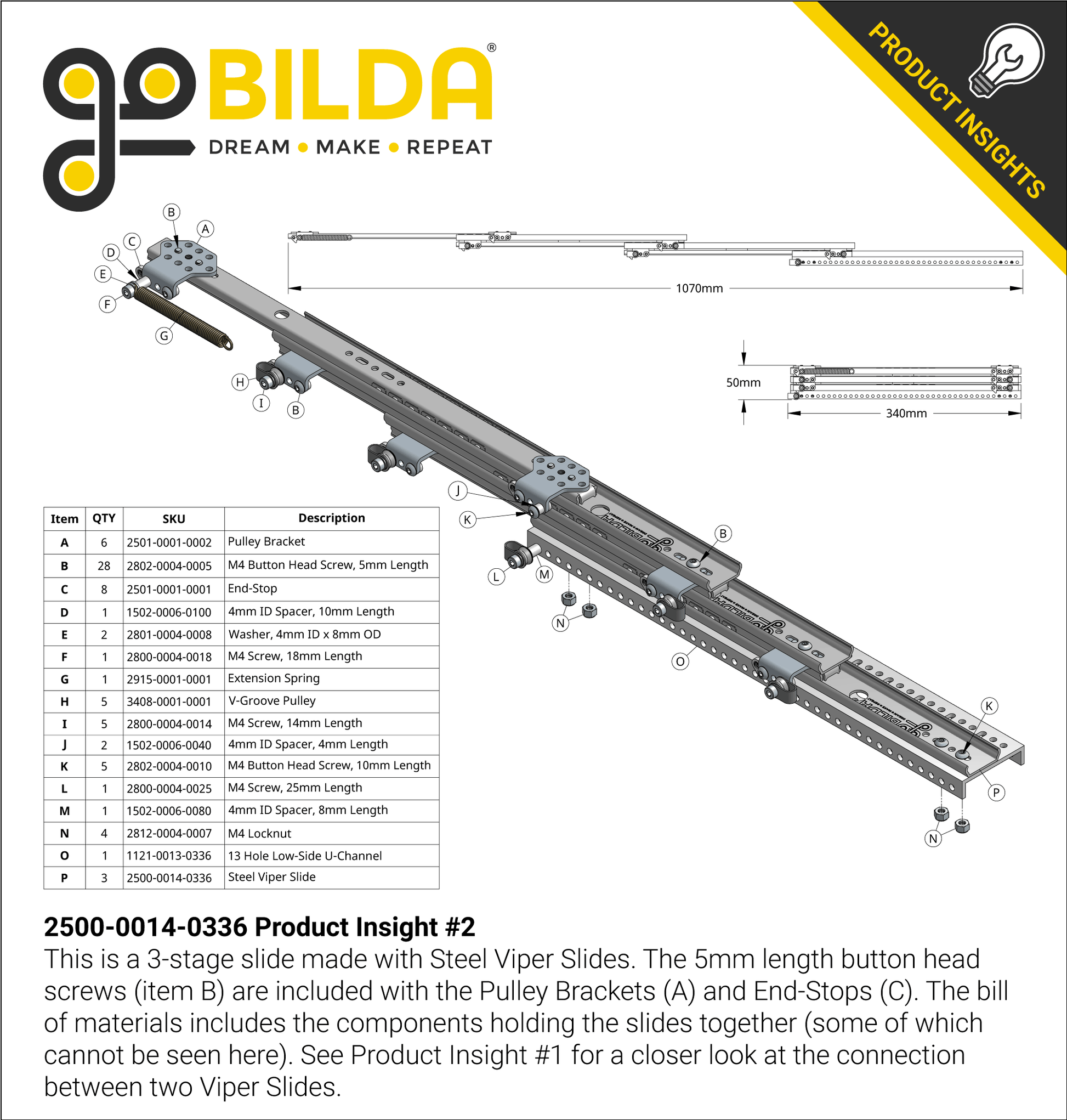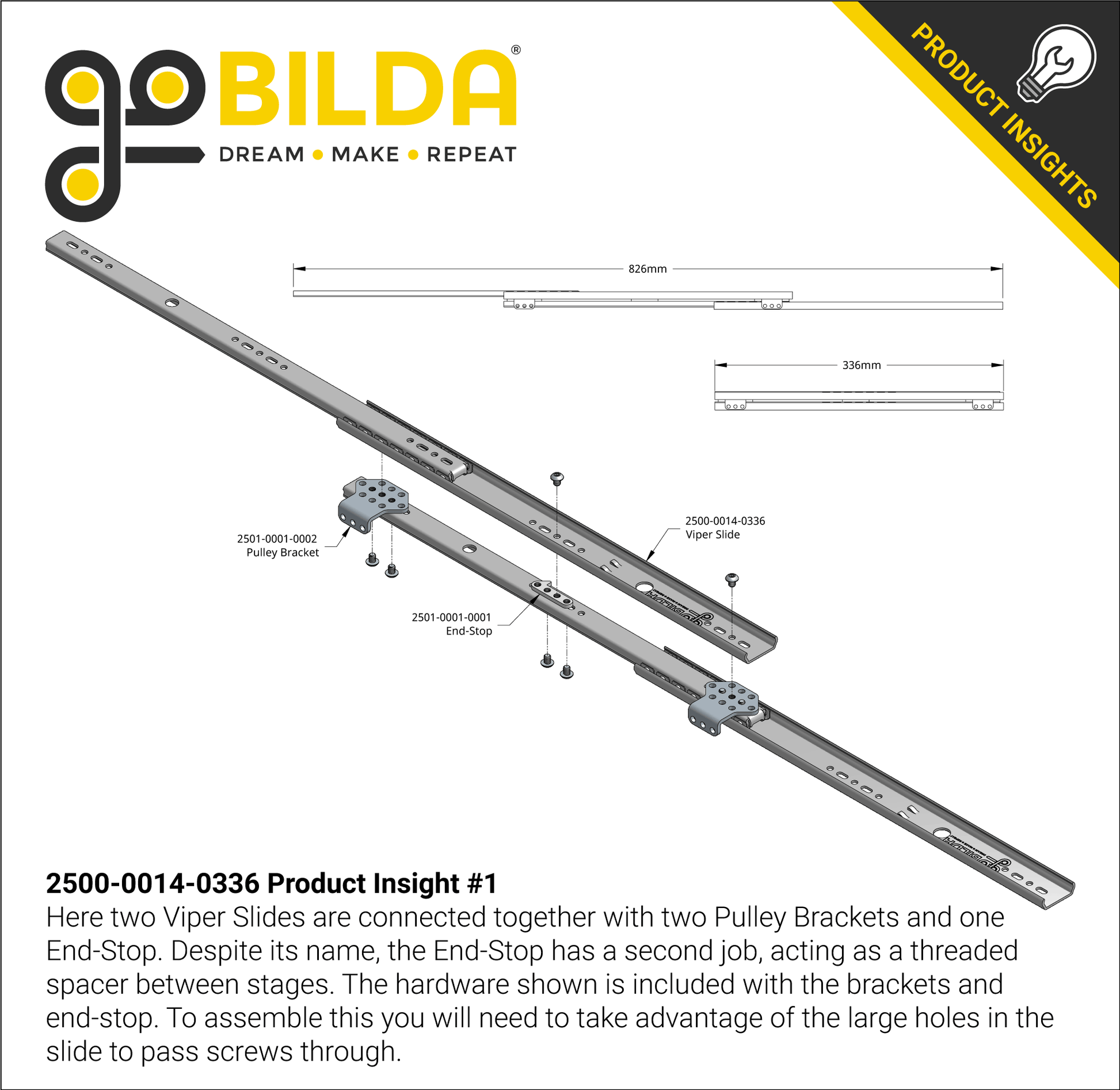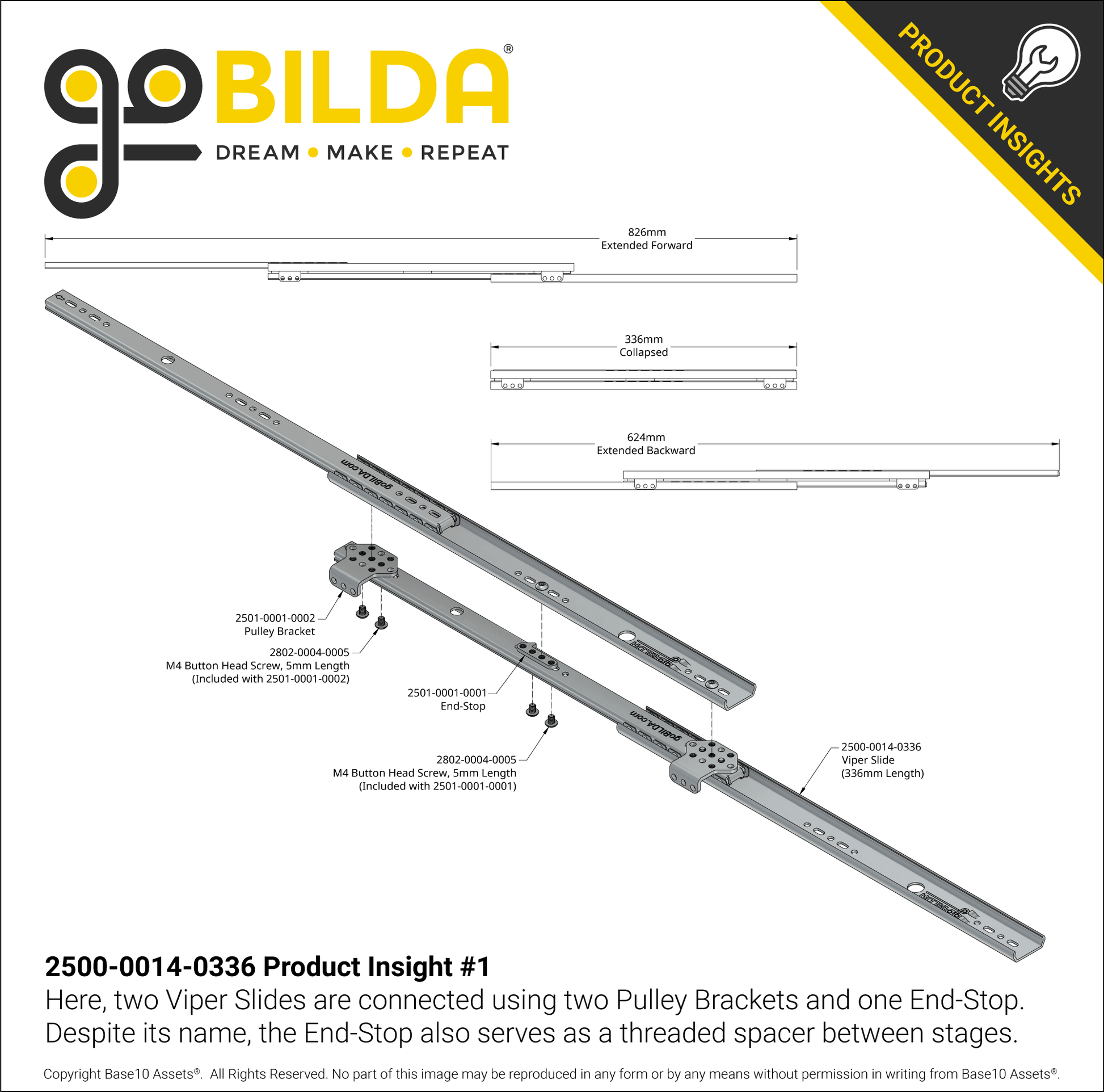 The goBILDA Viper-Slides are a smooth and strong solution for your linear motion needs. The slides are constructed of 1.5mm thick steel so that you can build lifting and reaching mechanisms without 'pairing' them up as many do in robot challenges that call for lifting objects. Whereas the races of an aluminum slide will wear over time and cause slop, steel slides are built to last! The combination of 4mm thru-holes, 4mm slots and clearance holes makes fastening these slides to one another extremely easy using M4 hardware.