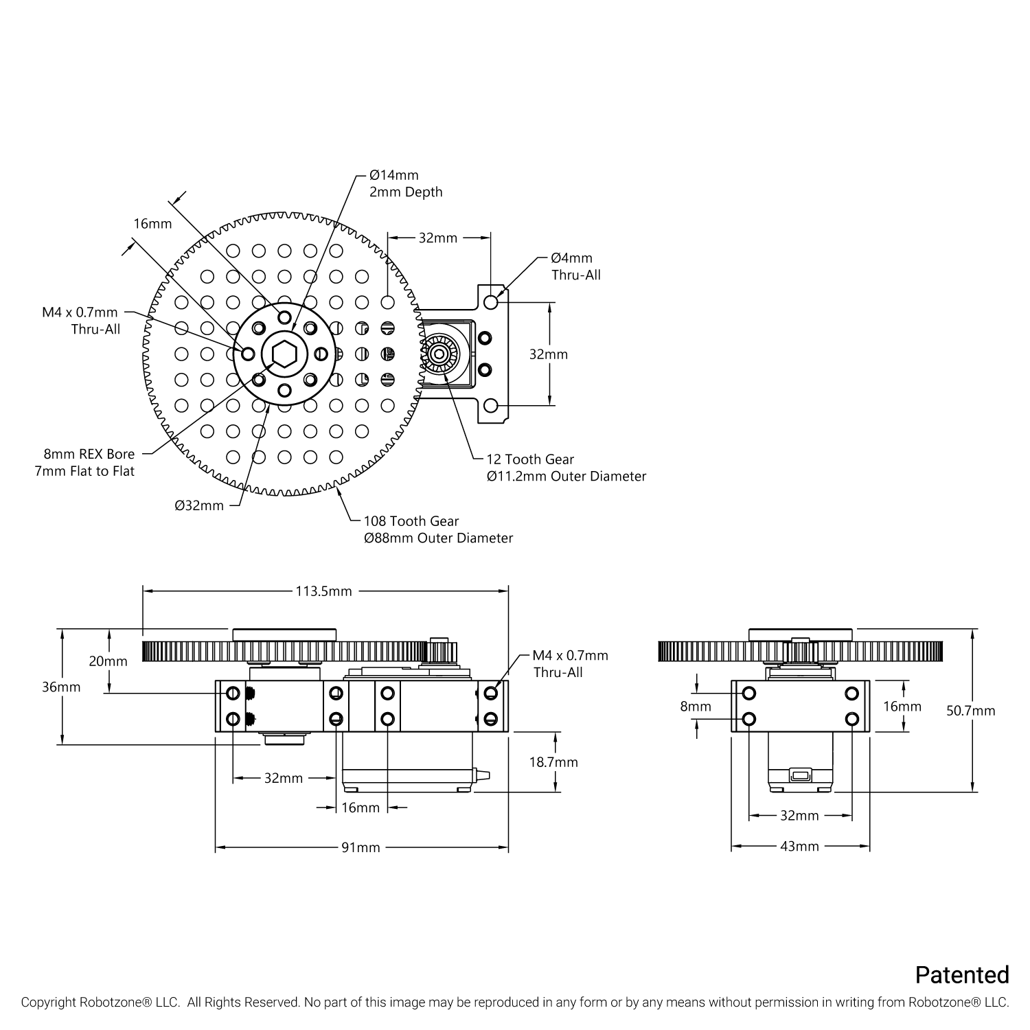 Having the servo mounted in the gearbox isolates the load to a steel hub-shaft that is supported in a pair of ball bearings to protect the servo from any axial loads. The gearbox opens up a world of mounting possibilities given the M4 threaded holes on each side which are on the grid pattern for compatibility throughout the goBILDA® system. The hub on the top of the gearbox provides threaded holes to fasten to, but you can also opt to fasten straight to the aluminum output gear using M4 hardware and standoffs or spacers. The 8mm REX bore of the hub-shaft can drive an 8mm REX shaft or act as a wire pass-thru.