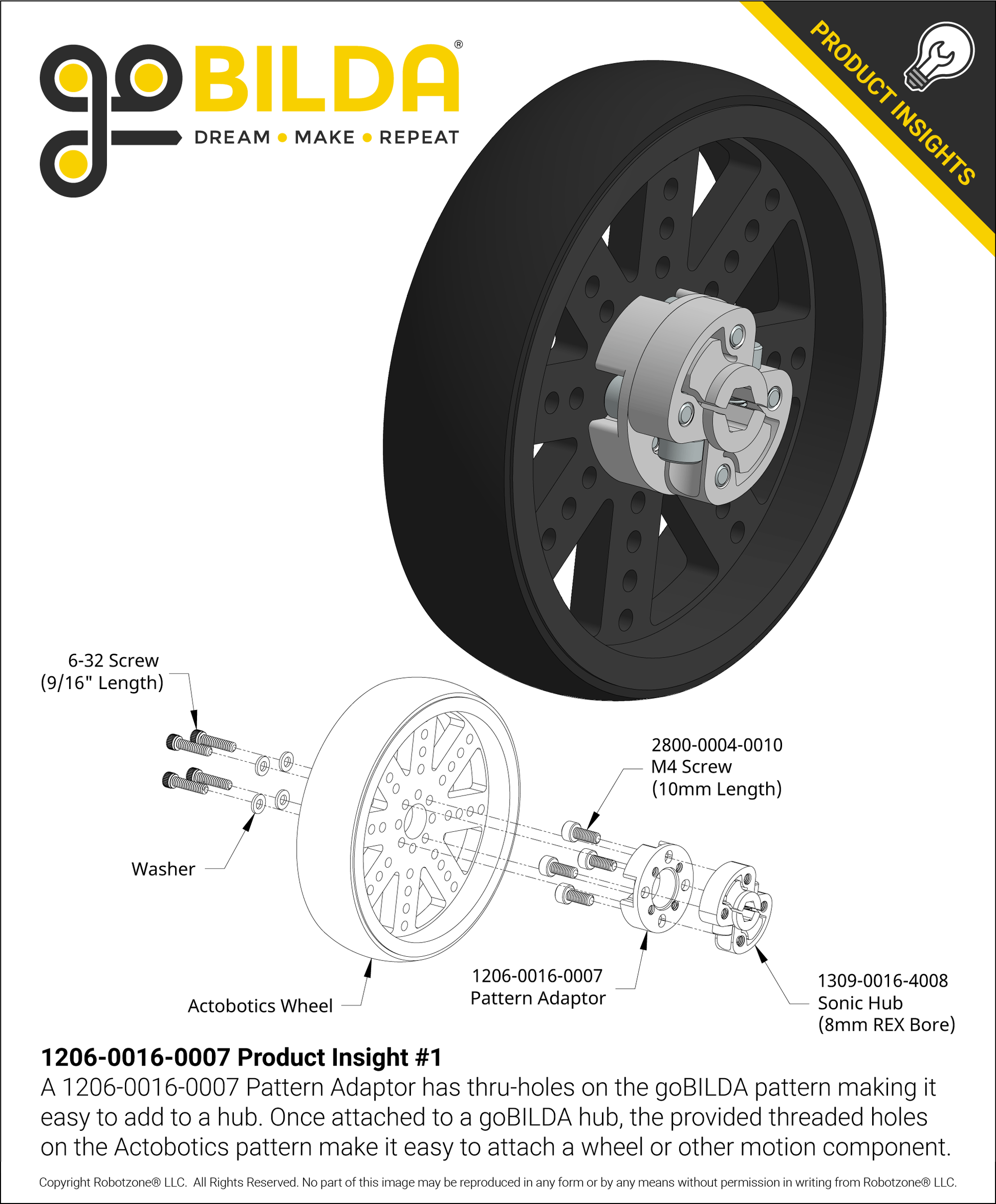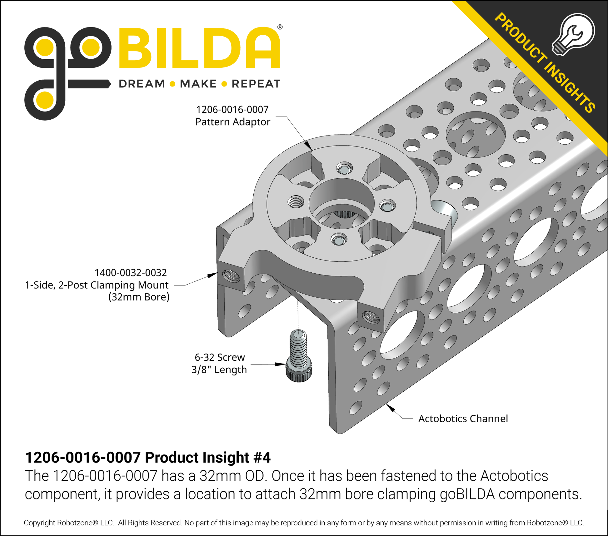 The remaining holes are positioned on the Actobotics 0.77” pattern, and threaded to 6-32 UNC so that you can fasten any Actobotics thru-hole component with ease.