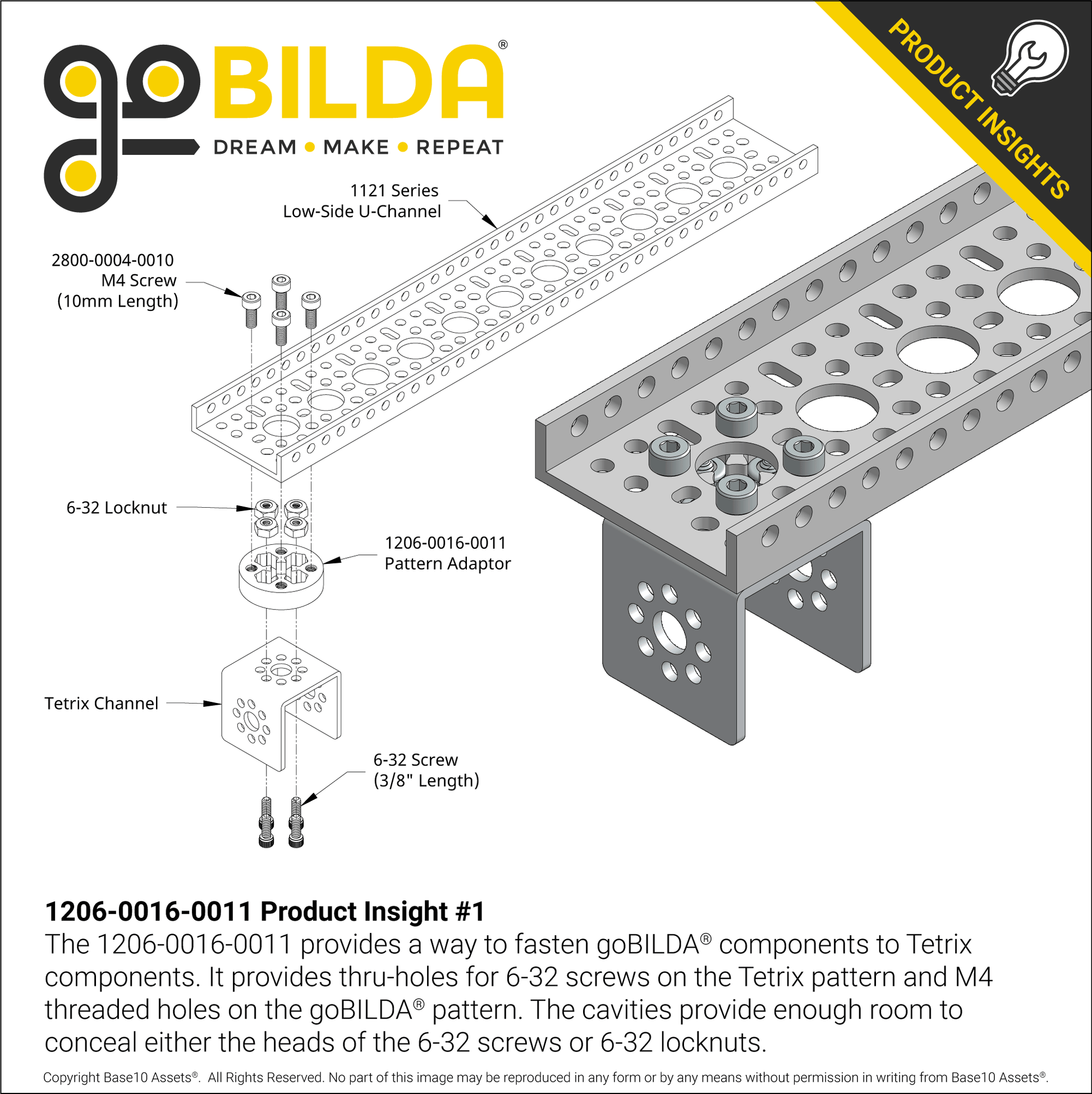 The thru-holes of this adaptor align with the 16mm pattern of the Tetrix build system. The 6-32 screws or 6-32 locknuts from your Tetrix toolbox fit nicely in the counterbores, leaving the top surface clean and clear for the fastening of your next component.
