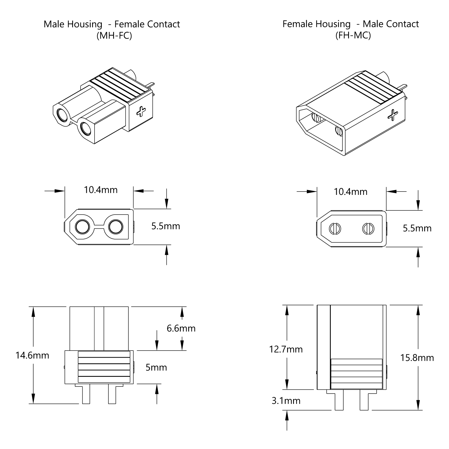 XT30 connectors are able to handle 30A continuous and 65A peak. The connectors have solder cups to install up to 16AWG wire into. They are polarity specific, meaning you can’t accidentally plug your battery or component in backwards. Their small form-factor allows the connectors to easily pass through the 14mm holes in goBILDA channel and components. You’ll find these same connectors on goBILDA batteries and chargers.