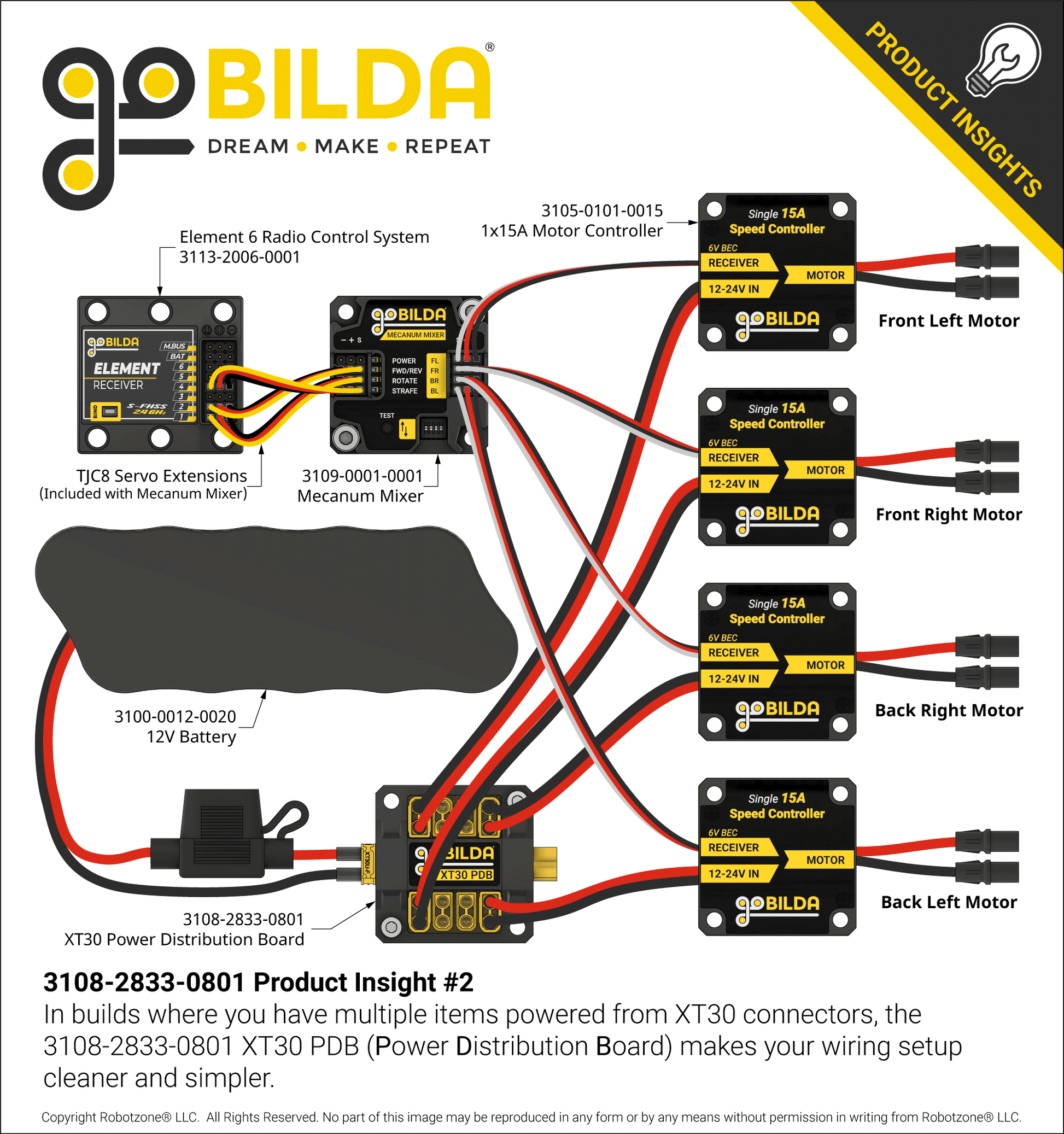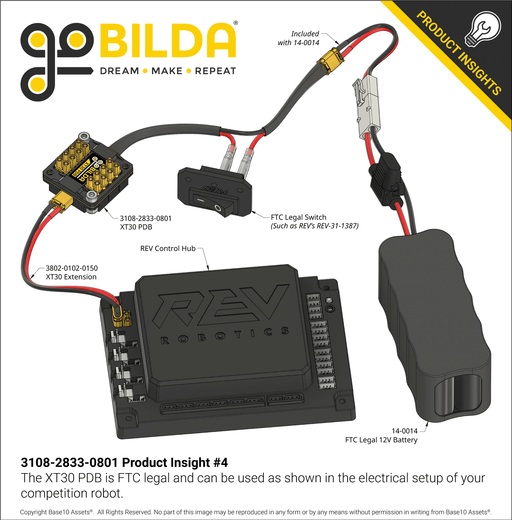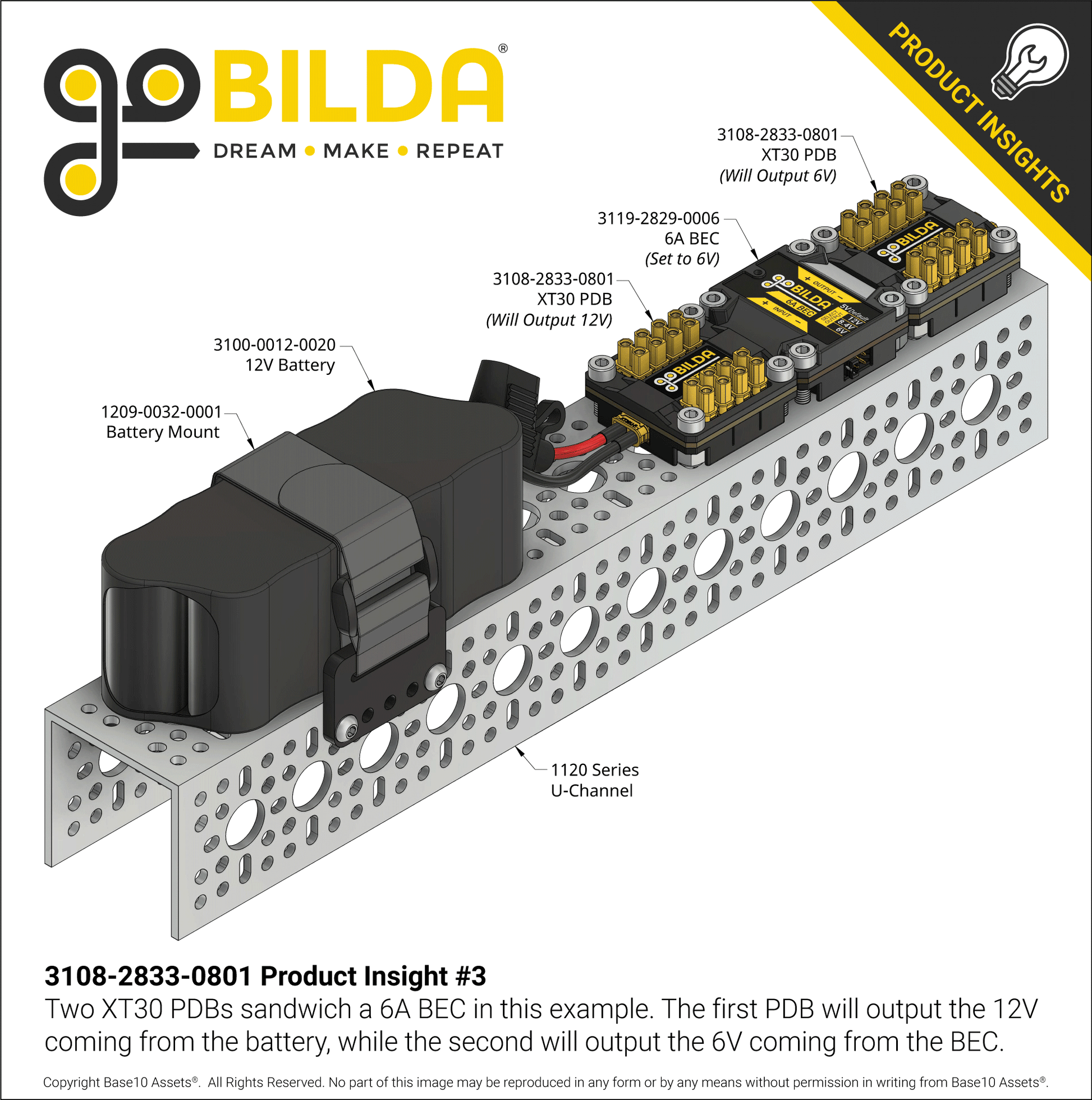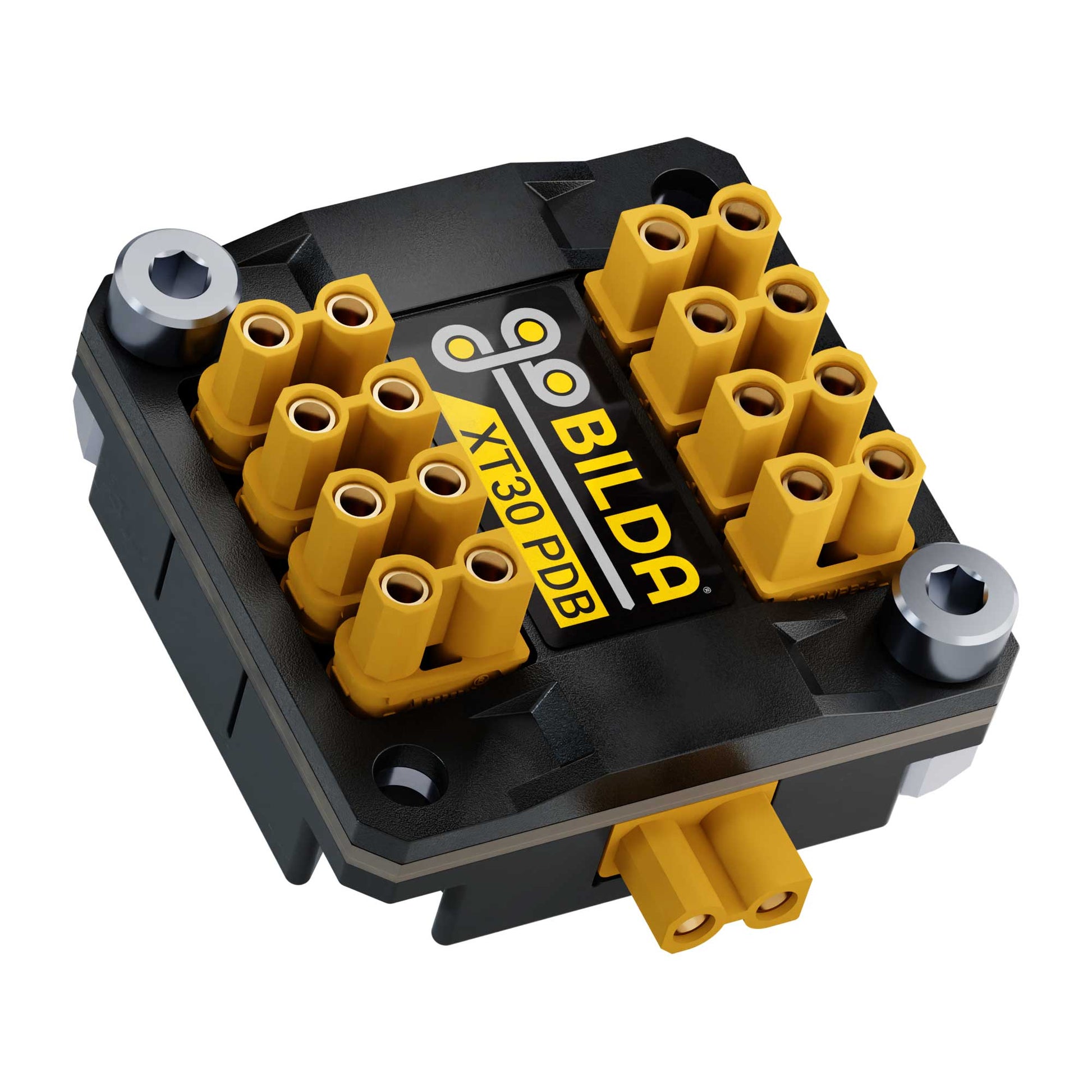 The Power Distribution Board (PDB) delivers power throughout your build! Just plug a power source into the PDB’s XT30 input. It’ll distribute that source’s voltage across eight face output connectors, as well as a side connector that’s conveniently located to daisy-chain with electrical components. And thanks to thru-holes on the goBILDA® 32mm square pattern, this PDB is extensively mountable to almost anything in the goBILDA® system!